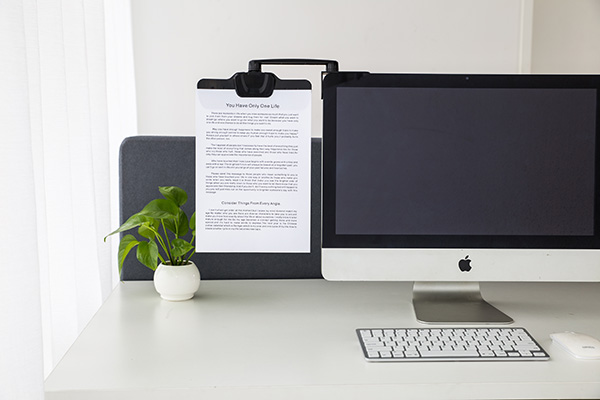 Die verstellbare Halterung hilft wirksam, muskuloskelettale Probleme zu lindern, die durch eine längere nach vorne geneigte Kopfhaltung entstehen. Was jedoch oft übersehen wird, ist, dass viele Menschen beim Lesen von Dokumenten den Kopf weiterhin senken. Um unangenehmes Lesen im Büro vollständig zu vermeiden, präsentieren wir eine einfache Monitor-Klammer. Durch das Anbringen des Clips an der Oberseite des Monitors können Sie Dokumente auf Augenhöhe lesen. 360"-Drehung.